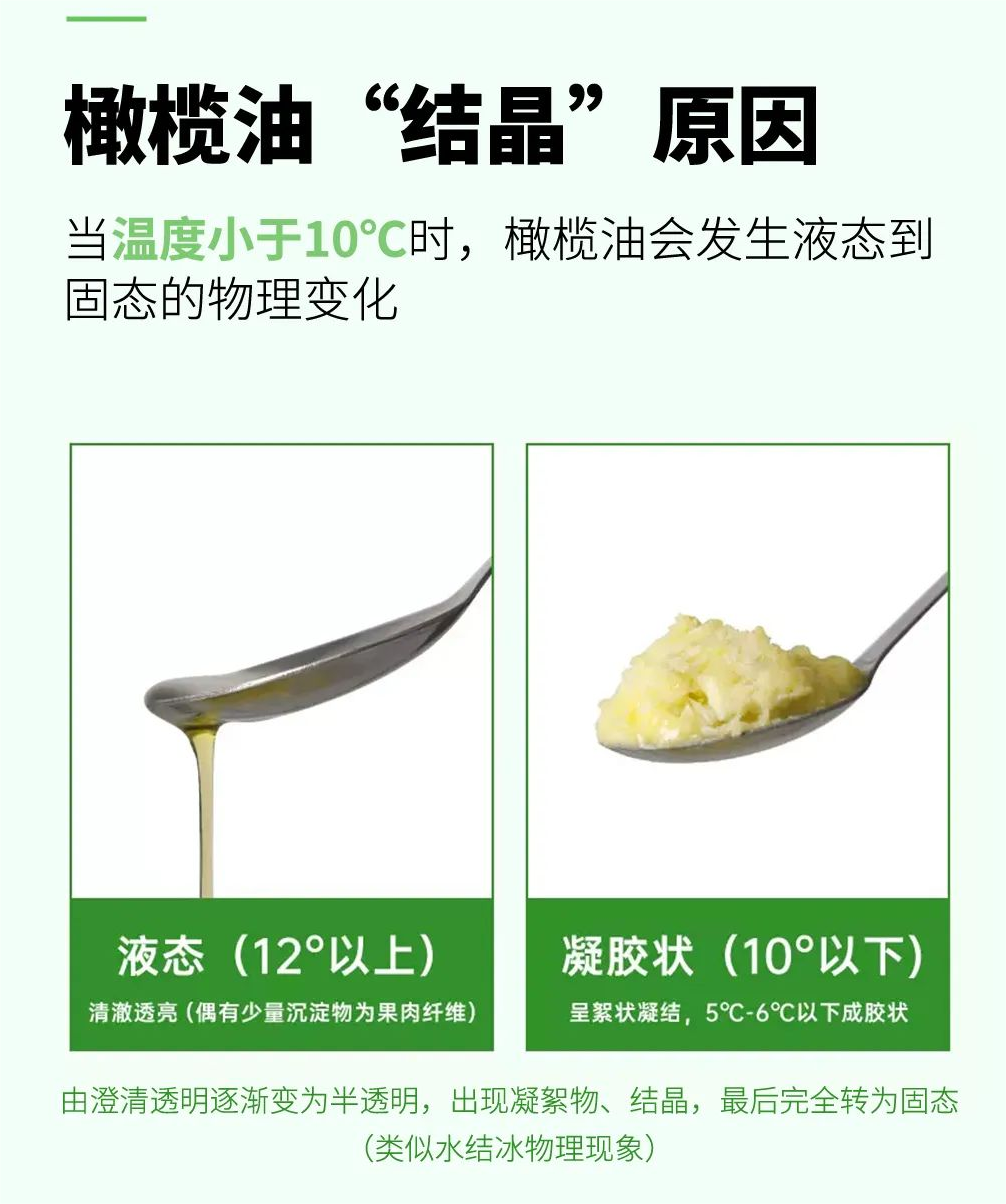 进入冬季,由南到北天气转冷,有部分橄榄油用户反映,早上起来发现家中的橄榄油瓶中出现了白色絮状物或凝固现象,这样是不是就代表变质了?还能吃吗?