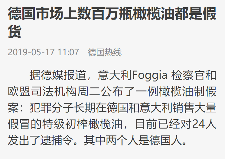 比如在德国,调查人员发现,德国市场上数百万瓶橄榄油都是假货!